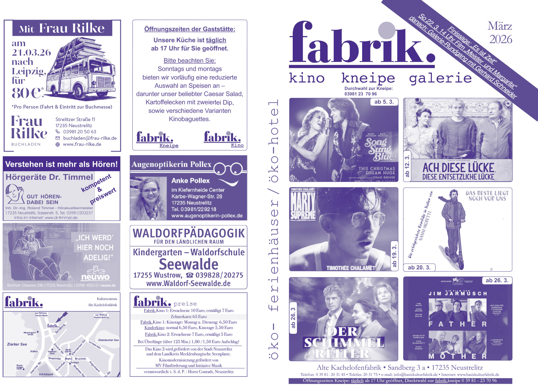 leider ist kein Ende der Kriege in Sicht - nicht in der Ukraine und auch nicht anderswo. Also bleiben wir bei unserer Forderung: "Frieden! Jetzt! Und für alle!" und geben die Hoffnung nicht auf, daß die Welt wieder friedlicher wird. Im Februar haben wir viele prominente Gäste zu wichtigen Filmen bei uns im Kino: Am 11. Februar kommt Heinrich Sabl mit seinem Film "Memory Hotel", an dem er 25 Jahre lang gearbeitet hat, zum Filmgespräch mit Matthias Wolf (ehem. Chefdramaturg am Landestheater), am 22. 2. gibt es eine Sondervorstellung mit Charly Hübner mit dem Film "Der Held von Bahnhof Friedrichstraße" und am 25. 2. kommt zum Film "Das Turiner Pferd" des kürzlich verstorbenen, sehr bedeutenden ungarischen Regisseurs Béla Tarr, der Kameramann dieses Films, Fred Kelemen, zum Gespräch nach Neustrelitz. Kürzlich gestorben sind auch die beiden Regisseure Hartmut Bitomsky und Rosa von Praunheim: Zu Hartmut Bitomsky präsentieren wir die nächsten Monate jeweils einen Film (s. Extra-Flyer): Wir beginnen am 30. 1. mit "Reichautobahn" und am 27. 2. mit "Der VW-Komplex". Und Rosa von Praunheim ist diesen Monat mit drei seiner Filme im Programm: Vom 5. bis 7. 2. "Meine Mütter - Spurensuche in Riga", vom 19. bis 21. 2. "Rex Gildo - der letzte Tanz" und vom 22. bis 24. 2. "Männerfreundschaften".