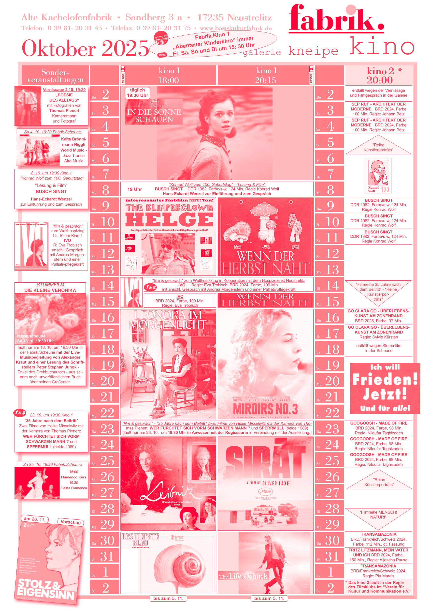 Gäste in diesem Monat werden sein: Gudrun Plenert, Hannes Schönemann, Hans-Eckardt Wenzel, Andrea Morgenstern, Peter-Stephan Jungk, Alexander Kraut und Helke Misselwitz. Wir freuen uns auf die entsprechenden Filmgespräche, die sich z. T. auch auf unsere Filmreihen "Konrad Wolf zum 100. Geburtstag" und das Begleitprogramm zur Ausstellung (2. 10. bis 23. 11.) "Poesie des Alltags - Fotografien von Thomas Plenert" beziehen.