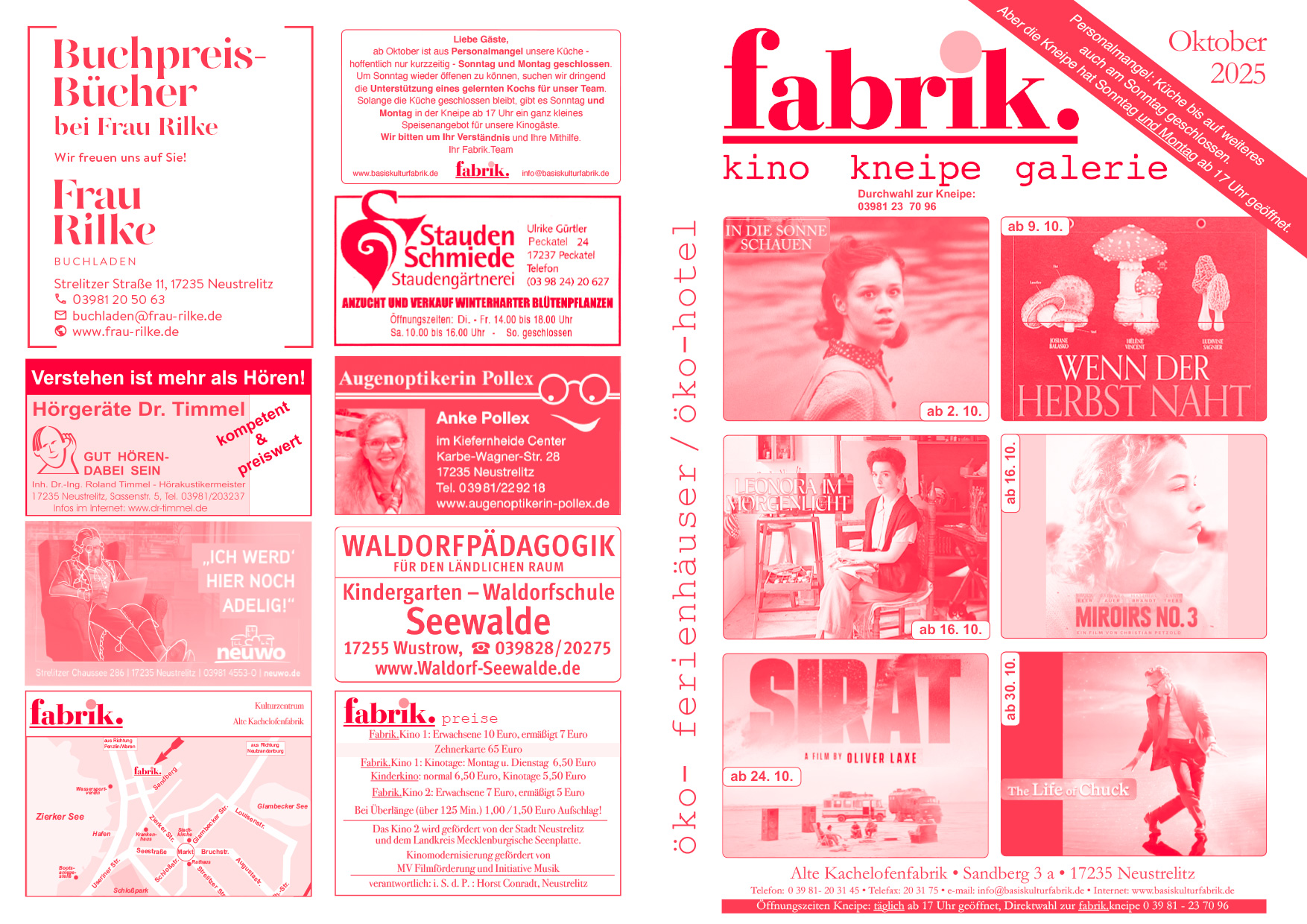Der Filmklub in der Alten Kachelofenfabrik betreibt das Fabrik Kino 2, das nunmehr seit 25 Jahren in der ehem. Schlosserei existiert. Wöchentlich werden in drei Vorstellungen zwei oder drei verschiedene Filme gezeigt. Sie sind das Salz in der Suppe unserer Filmkunstangebote in unserem Kulturzentrum: Filmgespräche, Diskussionsveranstaltungen, Thematische Filmreihen z.B. zum Thema "Mensch! Seele!", "Jüdische Lebenswelten im DEFA-Film", Filmreihen zu Regisseuren oder Schauspielern, viele Dokumentarfilme und anderes bereichern das Programm. Vieles von dem zeigen wir in Kooperation mit anderen Vereinen oder Stiftungen in der Stadt und im ganzen Land: Eine-Welt-Läden, Friedrich-Ebert-Stiftung, Gedenkstätten, Kunsthaus, Netzwerk-Inititativen, Umweltgruppen usw. Der Filmklub trifft sich zwei Mal im Monat, gestaltet das Programm und sichert die Abendvorstellungen im Kino ab. Wir sind als Mitglied im "Landesverband Filmkommunikation M-V" Teil der vielfältigen kulturellen Kinoszene im Land.