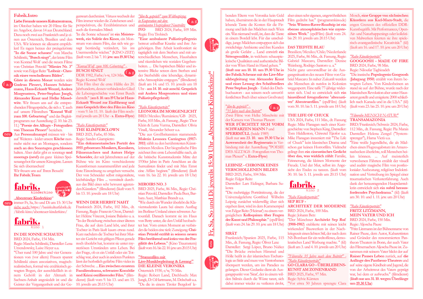 im Oktober haben wir 20 Filme für Sie im Angebot, davon 14 aus Deutschland. Dazu noch zwei aus Frankreich und je einen aus Österreich, Brasilien und den USA. Wir können sie allesamt empfehlen! Es ragen heraus der preisgekrönte "In die Sonne schauen" von Mascha Schilinski, "Busch singt", der letzte Film von Konrad Wolf und die neuen Filme von Christian Petzold "Miroirs Nr. 3" sowie von Edgar Reitz "Leibniz - Chronik eines verschollenen Bildes".