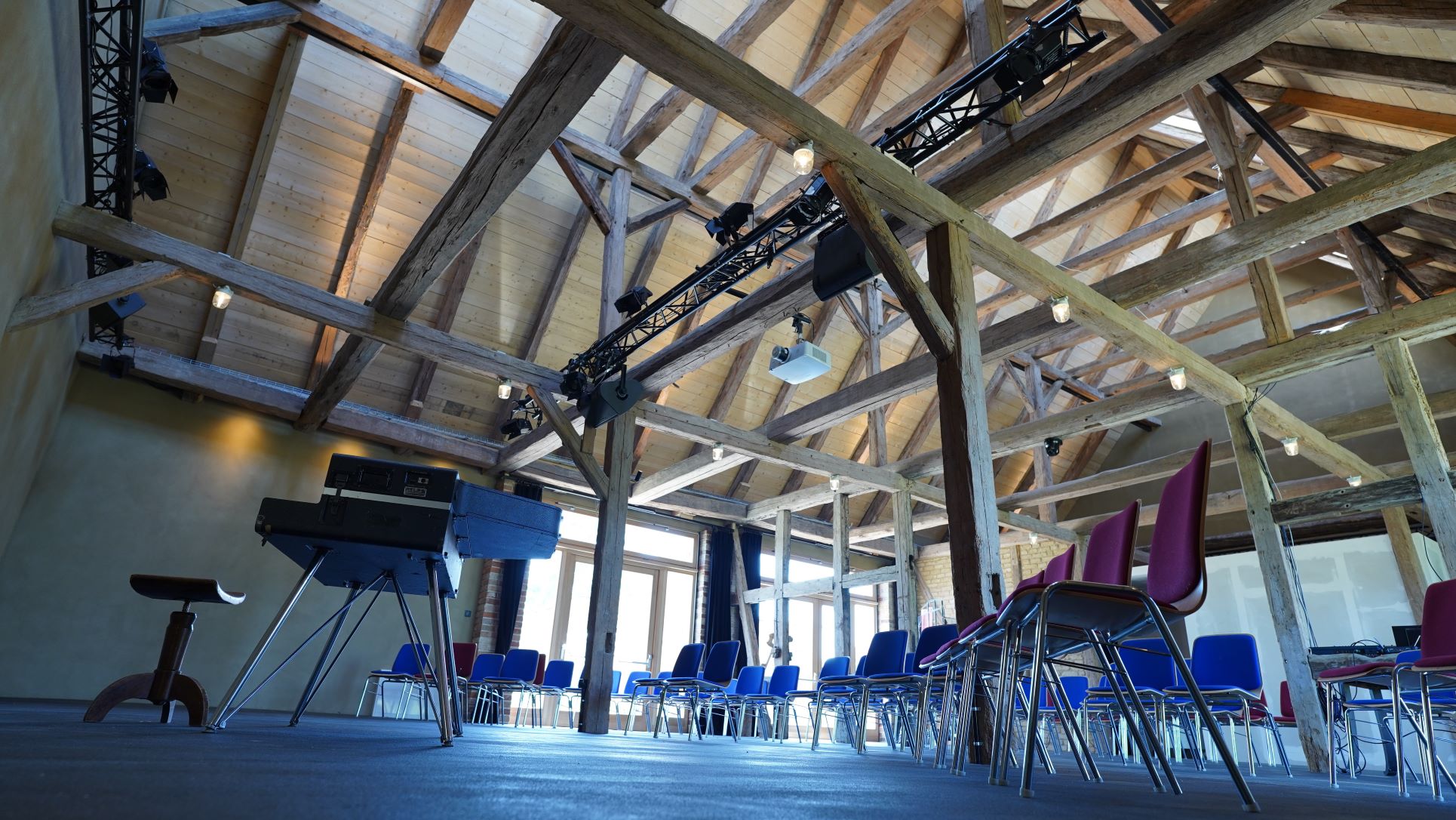 - technische Ausstattung: Leinwand und Beamer, Pinnwand, Whiteboard, Flipchart, Mikrofone, Bühne möglich, Rednerpult, Licht- und Tontechnik, WLAN, 4k Webcam inklusive Mikrofon, professionelle Kameratechnik für Ihren Livestream oder Ihr Online-Seminar, Yamaha Stage Piano (halbakustisch mit Hammermechanik)